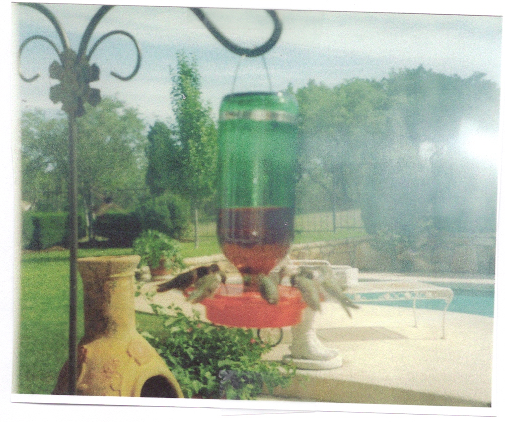 In the picture above, you will see  the hummingbirds sharing their feeder with another different bird.  This is what I call character!