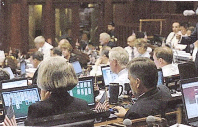 Such as reflected by House Minority Leader Lawrence F. Cafero, Jr., R-Norwalk, pictured at the edge on the far right with just his arm visible, speaks while colleagues Rep. Barbara Lambert, D-Milford and Rep. Jack F. Hennessy, D-Bridgeport, play solitaire Monday night as the House convened to vote on a new budget. The guy sitting in the row in front of these two – he’s on Facebook, and the guy behind Hennessy is checking out the baseball scores.
