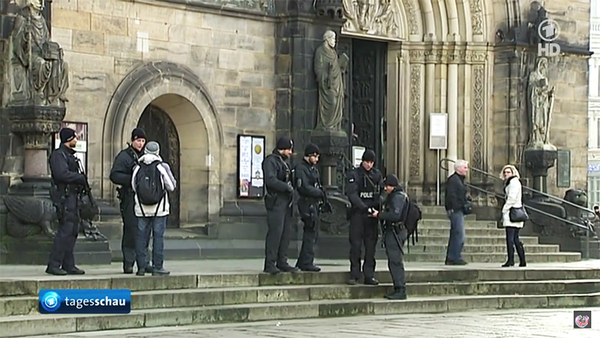 Heavily armed German police guard the Cathedral in Bremen, after receiving intelligence information that jihadists planned to attack the city’s Cathedral and synagogue.