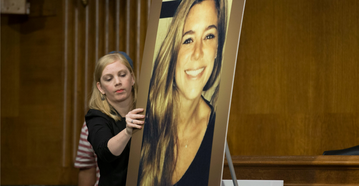 A Congressional staffer puts up a picture of Kate Steinle, who was fatally shot in broad daylight on San Francisco’s Pier 14 while walking with her father, Jim Steinle. Jim Steinle’s testified before the Senate Judiciary Committee on the death of his daughter on July 21, 2015.
