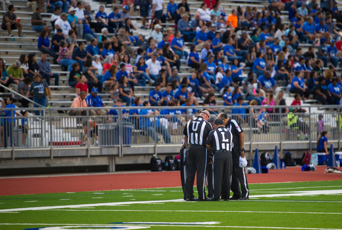 The officiating crew prayed before John Jay High School’s football game against Del Rio in San Antonio on Friday, a week after two John Jay players intentionally hit a referee.