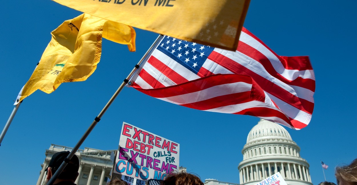 UNITED STATES – APRIL 6: Tea party activist on the East Front of the U.S. Capitol hold up signs and flags during a rally on Wednesday, April 6, 2012, days before a possible federal government shutdown. (Photo By Douglas Graham/Roll Call)