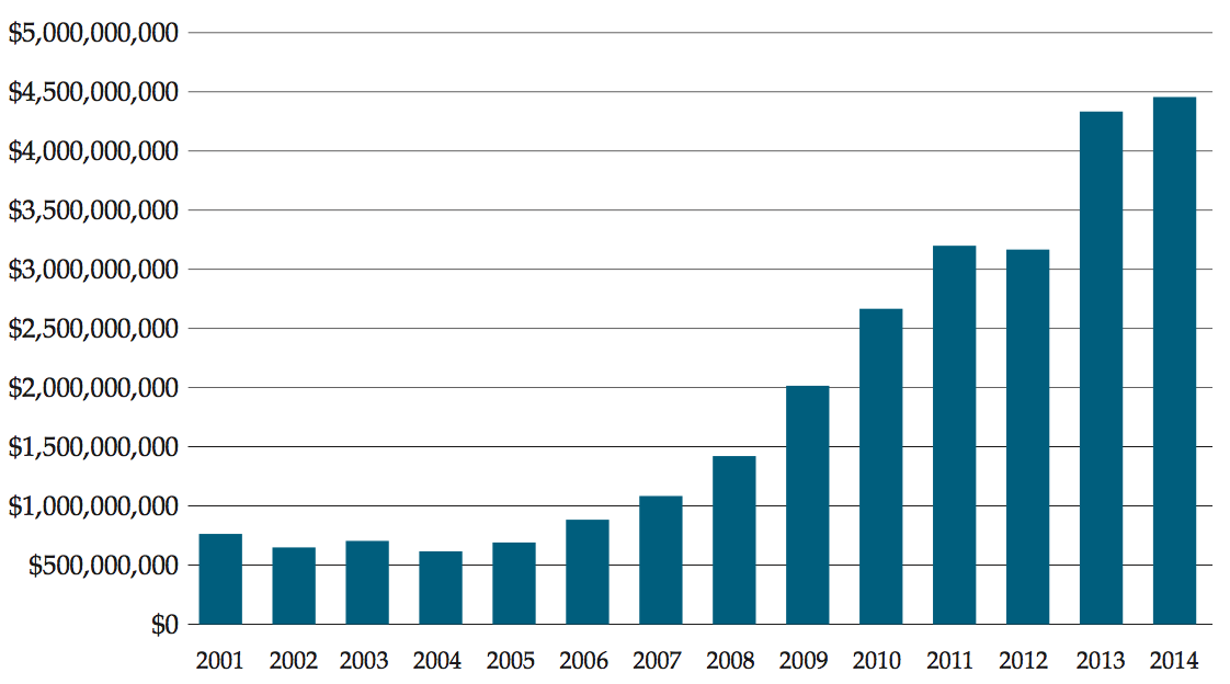 From 2000 to 2013, the Justice Department payments to local and state law enforcement agencies participating in Equitable Sharing topped $4.7 billion, according to the group’s report. Additionally, payments tripled from 2000 to 2013.