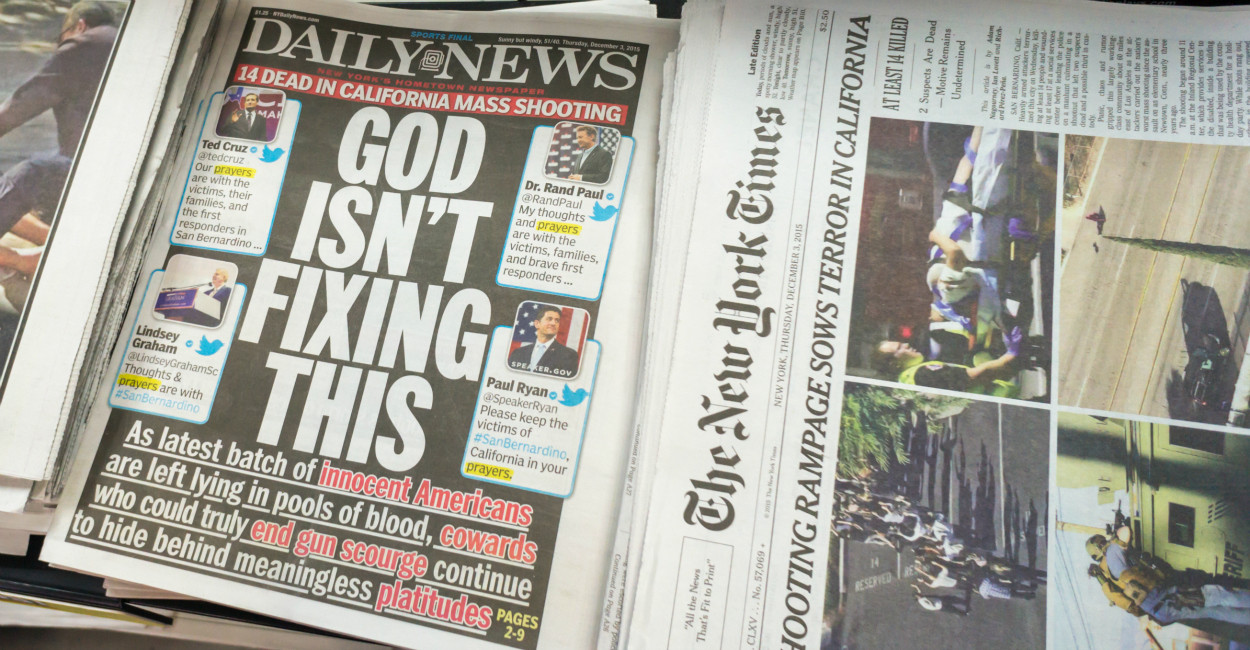 “’Daily News’ provokes with cover on Calif. shooting: ‘God isn’t fixing this’” is USA Today’s headline, while “The New York Daily News’s very provocative front page on the San Bernardino shooting” is the Washington Post’s.