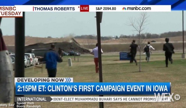 The van Clinton is using for her campaign road trip apparently pulled up to a back entrance of the Kirkwood Community College campus. This left a pack of reporters scrambling to see her enter the building.”