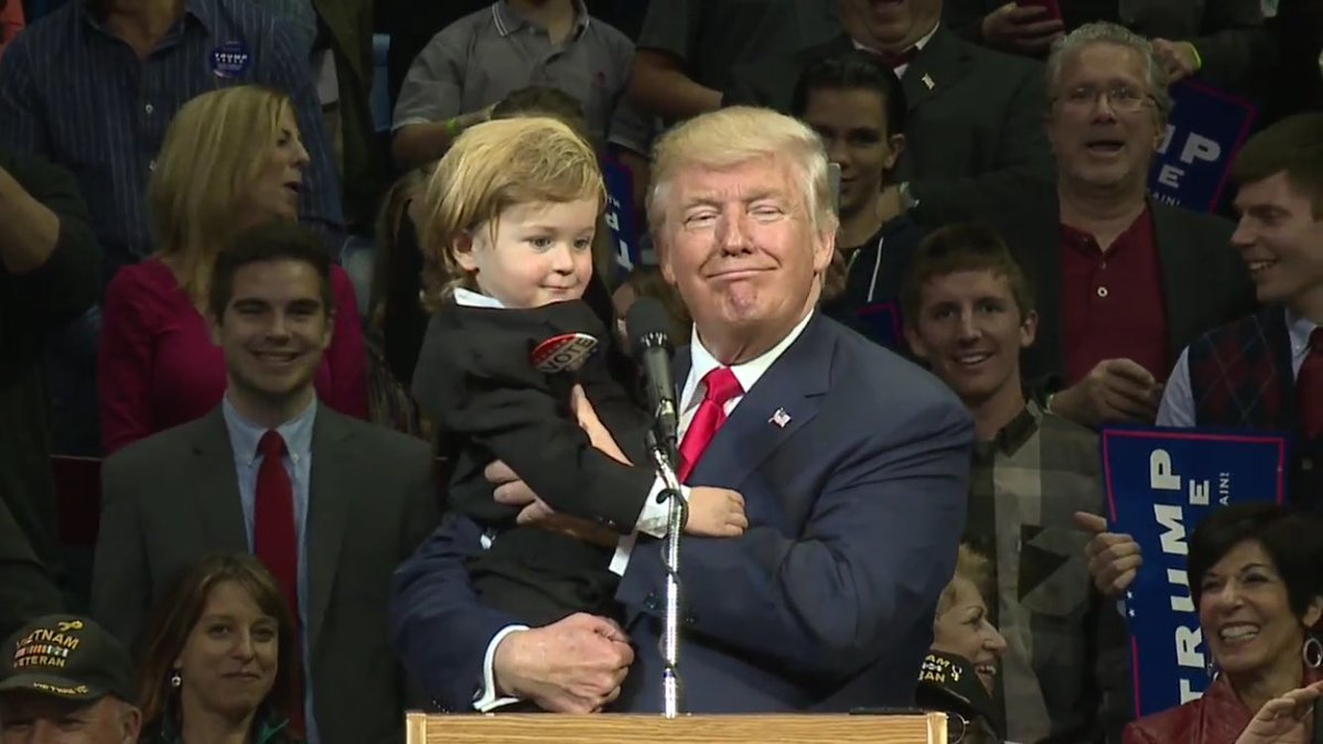 An aide handed the toddler up to Trump, and he carried him over to the microphone.