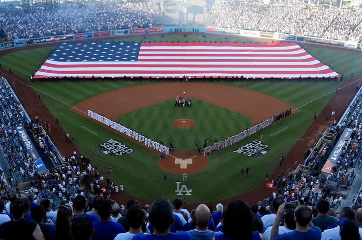 People stand in Los Angeles’ Dodger Stadium during the national anthem before Game 1 of the 2017 World Series.
