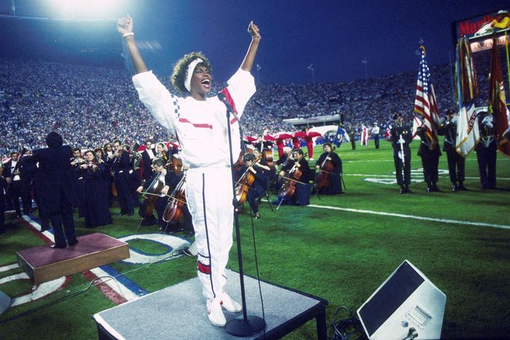 Whitney Houston sings the national anthem during the pregame show at Super Bowl XXV in 1991.