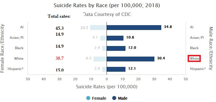 In 2018, white Americans committed more suicides than other racial/ethnic groups because of the disproportionately high suicide rate of white males.