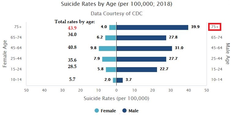 The much higher suicide rate of elderly men accounts for why the elderly (75 and older) have the highest suicide rate of all age groups — of 43.9 per 100,000.