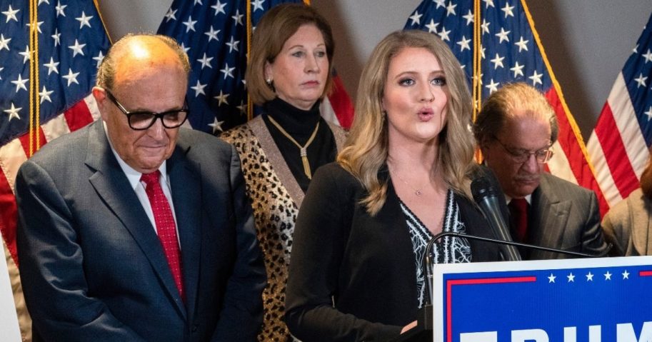 Members of President Donald Trump’s legal team, including former Mayor of New York Rudy Giuliani, Sidney Powell, and Jenna Ellis, speaking, attend a news conference at the Republican National Committee headquarters on Nov. 19, 2020, in Washington. (Jacquelyn Martin / AP Photo)