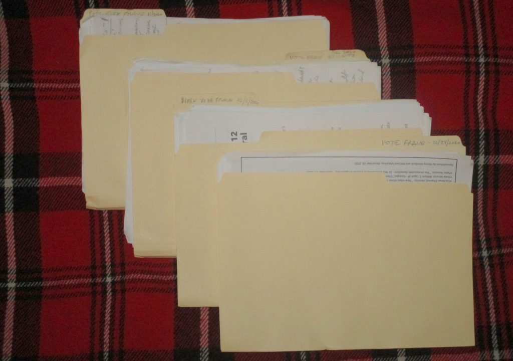 Here are the four files I personally have compiled on this topic since Election Day. As you can see, they brim with page after page after page of non-evidence.