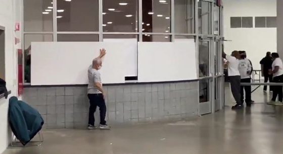 Democracy dies in darkness: In a direct attack on transparency, election workers conceal windows at Detroit’s TCF Center vote-tabulation facility. This made them invisible to GOP vote challengers and other observers, November 4, 2020. (Photo: Screenshot from @MattFinnFNC via Twitter)
