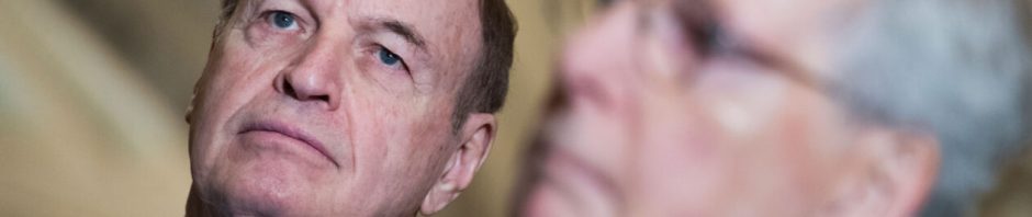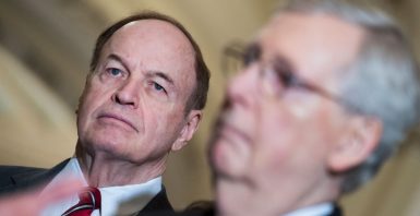 The since-retired Sen. Richard Shelby, R-Ala. (left) and Sen. Mitch McConnell, R-Ky.—seen here talking to reporters Feb. 12, 2019—got rolled in negotiations with Democrats on the omnibus spending bill. But 18 Republican senators inexplicably voted for it anyway. (Photo: Tom Williams/CQ Roll Call/Getty Images)