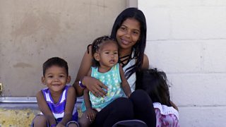1:03Migrant mother tells children: ‘We’re on a quest to find the treasure’