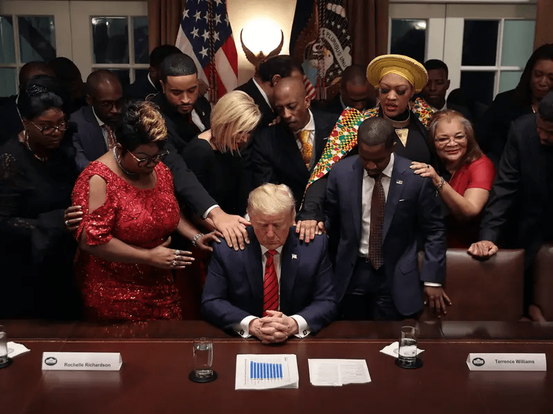 African American supporters pray for President Donald Trump at the conclusion of a meeting at the White House on February 27, 2020.