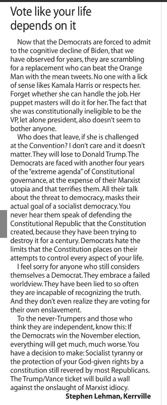 To help you understand, a lot of people do not like President Trump because he tweets things you don’t like or other things; but, think about how he put our country back on track and the difference in our country’s prosperity and what we are experiencing today with Biden/Kamala. Forget what you don’t like and sacrifice your dislike for the sake of our country and our freedom and for God’s sake. The Marxists/Democrats do not like or believe in God.